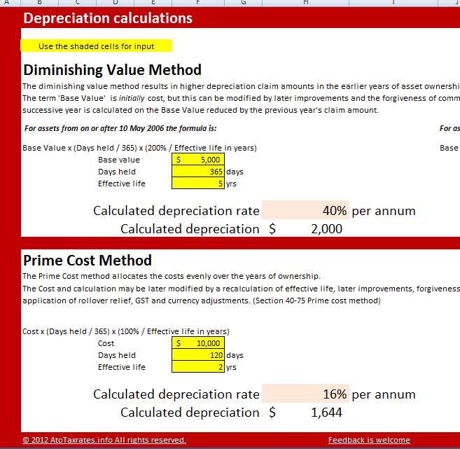 The calculator converts number of years to a depreciation percentage rate so you can get an actual depreciation claim amount in dollars. You can also see the comparison between the Diminishing Value and Prime Cost calculation methods.